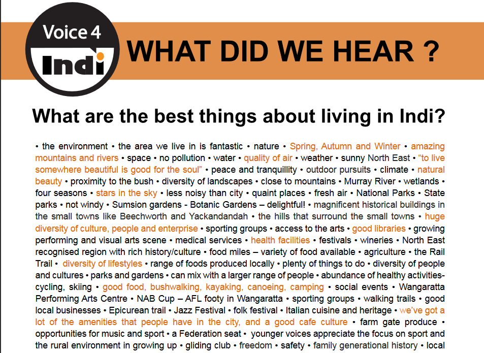 V4i has shown that one simple piece of the puzzle for switching Australians back onto politics is to invite people into the conversation and make it safe to do so. The culture of an electorate and the way it engages with politics can be changed. As was demonstrated for the first time in Indi with the election of Cathy McGowan in 2013, this can happen very quickly.