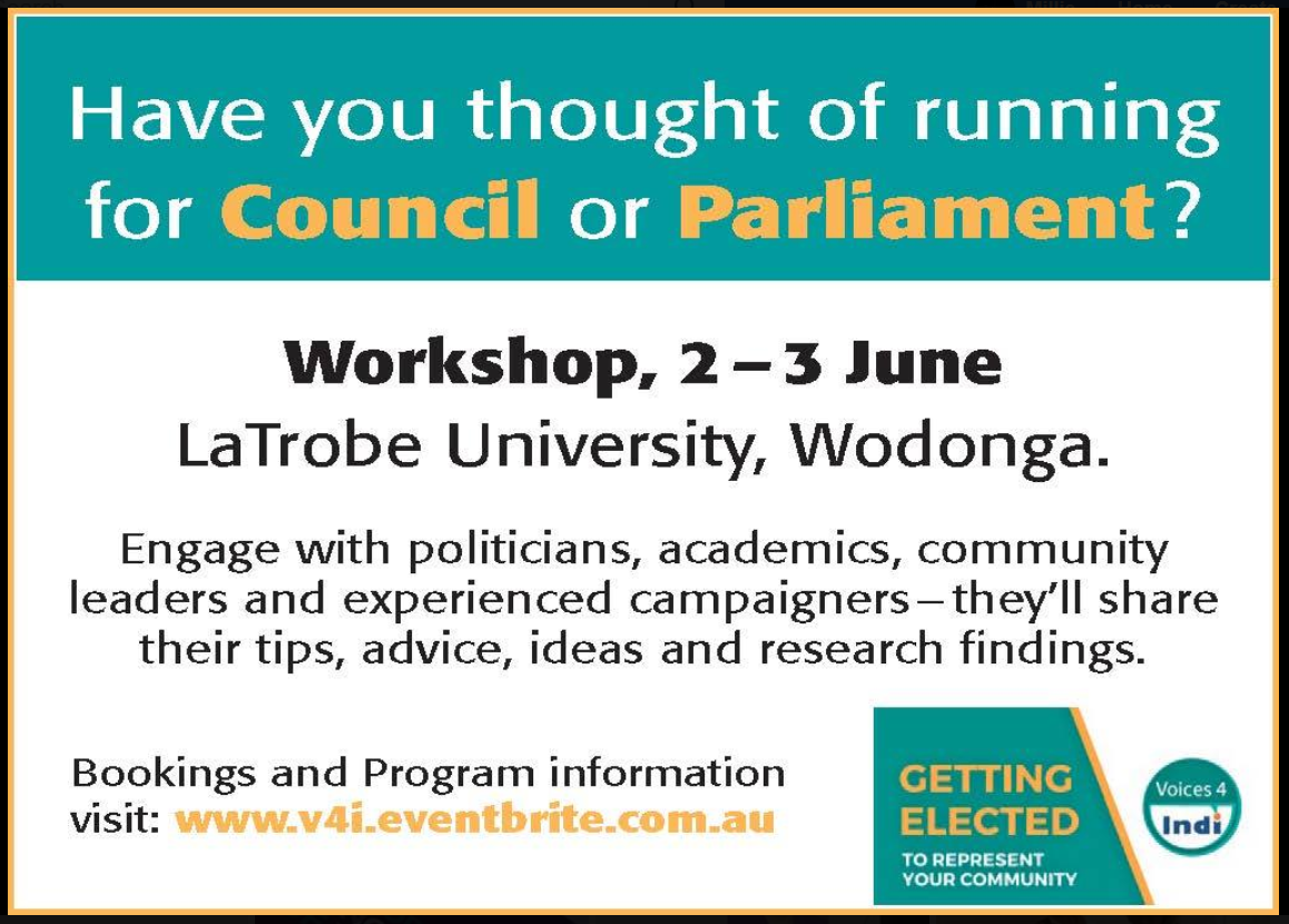 V4i trusted their community to choose their own candidate. First, the V4i crew began educating and supporting the electorate to encourage people to put their hands up as a candidate. Open to anyone interested (including members of political parties), they held a ‘Getting Elected – To Represent Your Community’ workshop in June 2018 on what it means to run for parliament and to be a parliamentarian or to support a candidate. They talked about the impact on spouses and families; about trends in Australian politics, young people in politics, listening to your community, representing your community, policy, voting patterns (psephology!), working with media, insurance and campaign strategy.