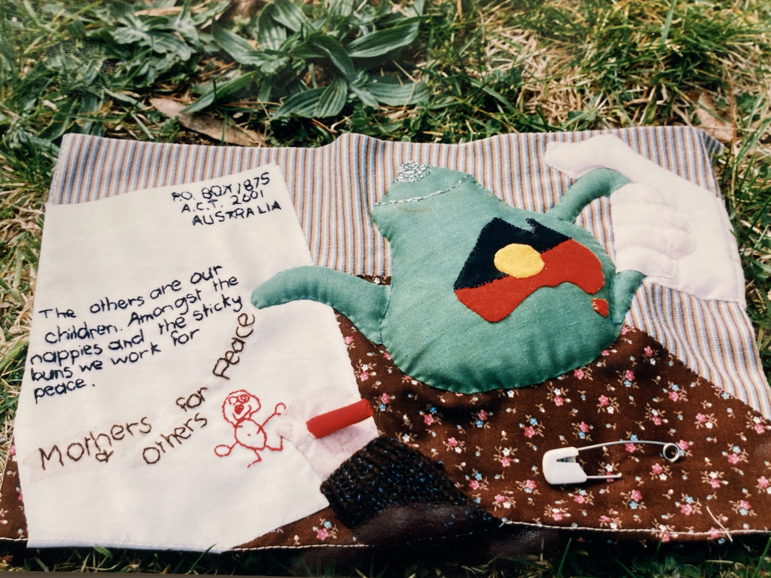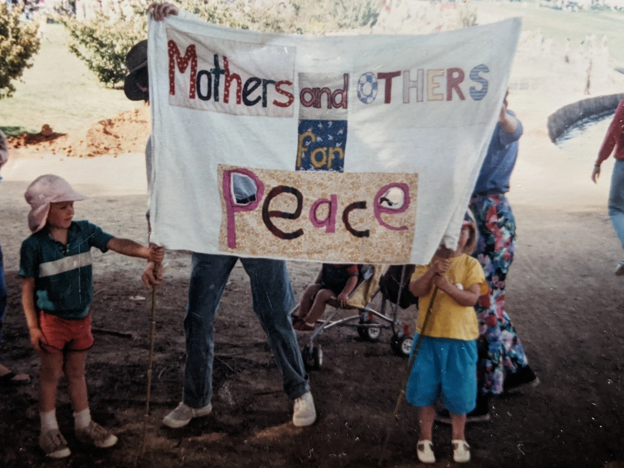 My favourite event that those of us ‘others’ (the children) still talk about was a particular protest they were involved in to shut down the AIDEX arms bazaar in Canberra. What we all love about this action is that the mothers attended in their dressing gowns waving beautiful banners they’d made out of our cloth nappies. My mum’s was particularly gorgeous with a series of four nappies that showed the progression of a tank being turned into a toy train.