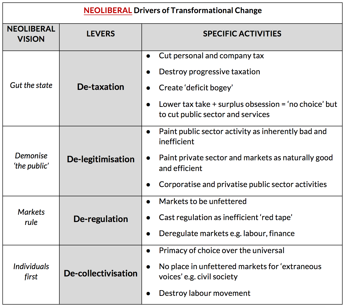 This table highlights some of the key drivers used to deliver the neoliberal ideal: