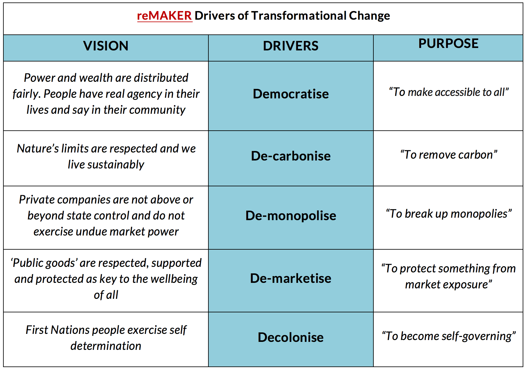 Below we begin to unpack democratise, de-monopolise and de-marketise. Please note there is a process in place, coordinated by CANA (the Climate Action Network of Australia) looking at what deeper work is required to de-carbonise and so this paper doesn’t attempt to preempt this work. Similarly, there are processes amongst First Nations people to identify their priorities as regards decolonise and again we await their proposals.
